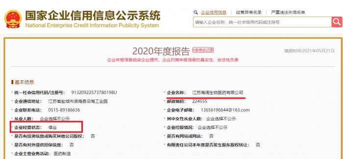 也就是说,海阔生物在2020年底就已经不再具备医药企业生产资质,也不可能继续生产。更重要的是,国家企业信用信息公示系统显示,海阔生物在2020年处于停业状态。