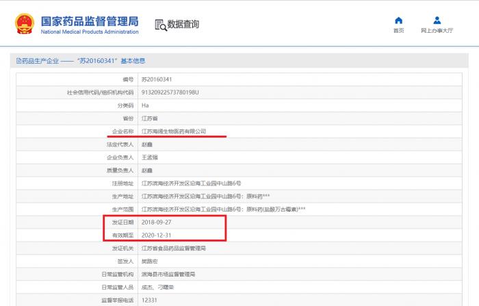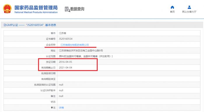 国家药品监督管理局的信息显示,海阔生物的药品生产企业证书已于2020年12月31日到期,GMP证书也已于2021年4月4日到期。