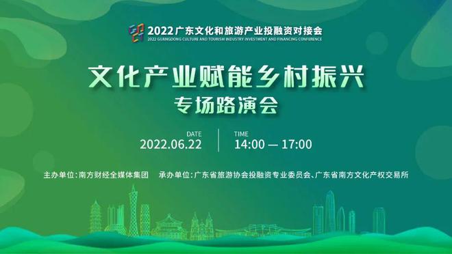 6月22日下午,为贯彻落实《关于推动文化产业赋能乡村振兴的意见》,配合国家和省委省政府助企纾困的有关决策部署,持续打造好广东文化和旅游产业投融资对接会平台,由南方财经全媒体集团主办,广东省旅游协会投融资专业委员会和广东省南方文化产权交易所协办的2022广东文化和旅游产业投融资对接会系列活动之“文化产业赋能乡村振兴”专场路演会在广州289艺术园区举办。