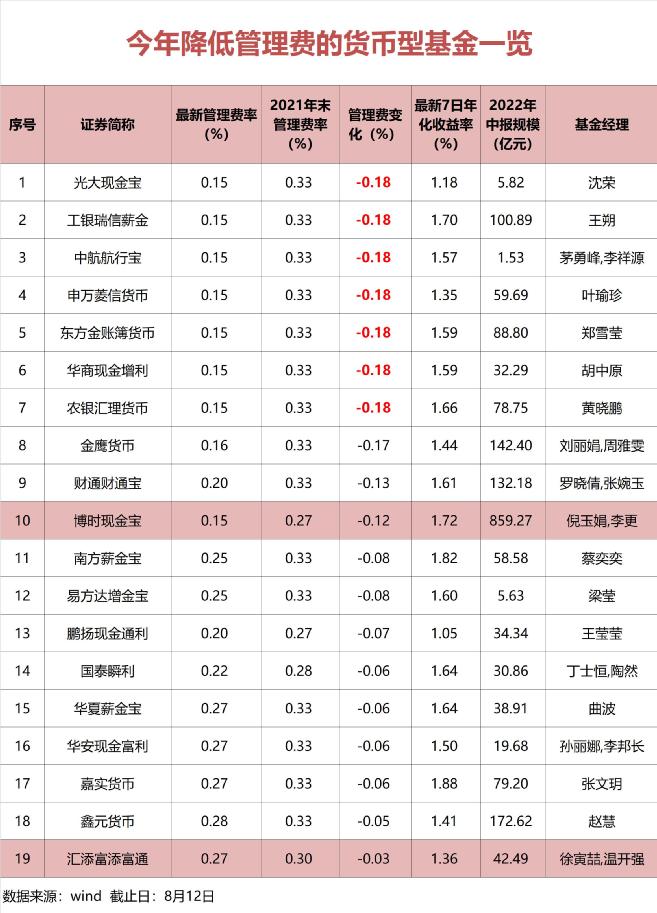 除了嘉实货币外,今年以来还有光大现金宝、工银瑞信薪金、中航航行宝等18只货基降低管理费,最低降至0.15%管理费率,相比降费前费率下降了18个BP,降费幅度高达55%。