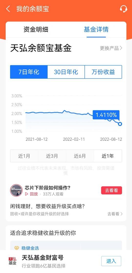 从货基收益率水平看,Wind数据显示,截至8月12日,目前货基平均7日年化收益率降至1.44%,已经跌破了1.5%的整数关口。规模最大的货币基金——天弘余额宝,最新7日年化收益率也达到1.41%的年内低点,万份收益也从年初的5毛多降到3毛多。