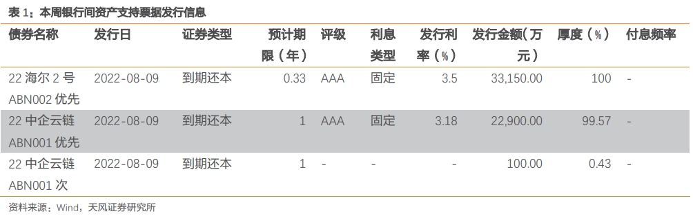 本周银行间市场 1 期资产支持证券公开发行,规模 21.71 亿元;有 2 期资产支持票据公开发行,规模 5.62 亿元。
