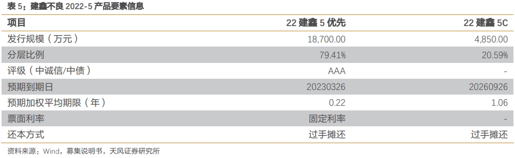 基础资产:资产池涉及 4,938 笔贷款,资产池的入池总金额为 169,253.50 万元,单笔平均未偿本息费余额 34.28 万元,单笔最高未偿本息费余额 310.01 万元,加权平均贷款合同期限 12 月。