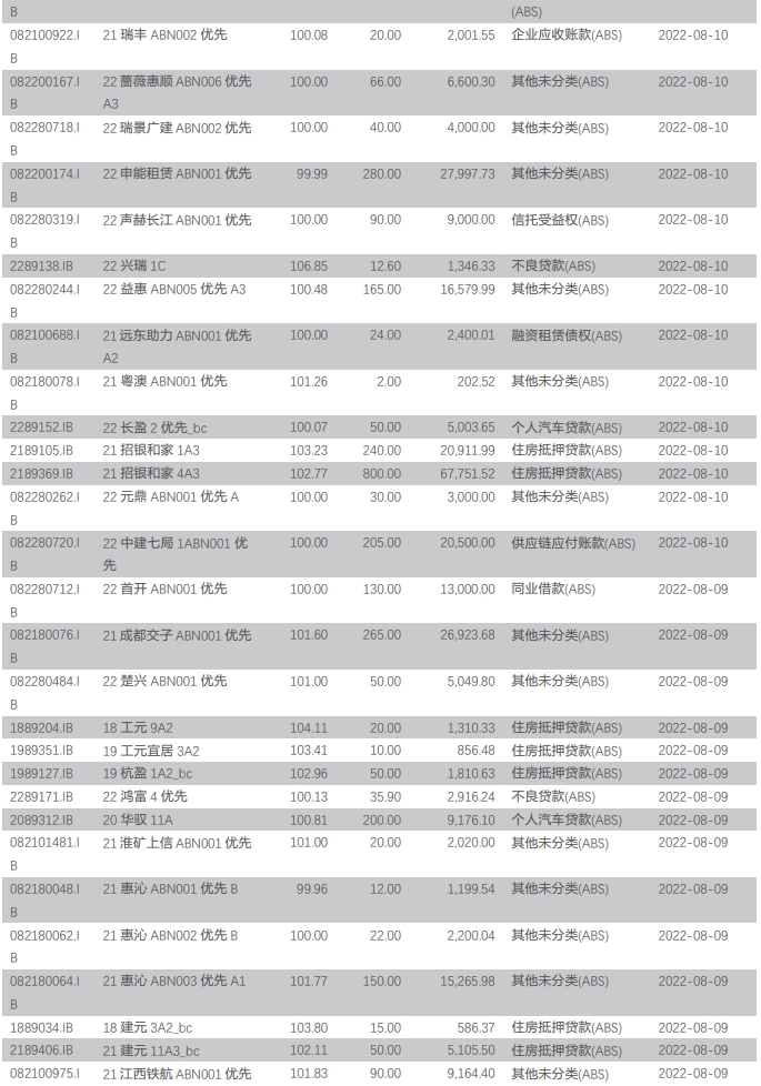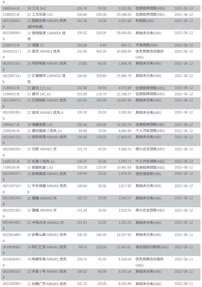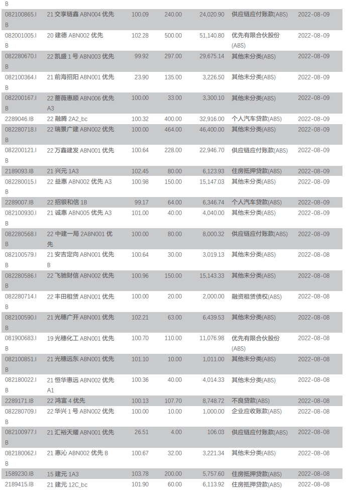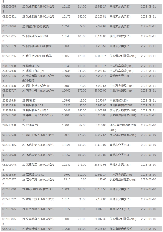 周银行间资产支持证券成交 126 笔,成交金额 133.65 亿元,基础资产类型包括住房抵押贷款(ABS)、优先有限合伙股份(ABS)、银行/互联网消费贷款(ABS)、信用卡分期贷款(ABS)、信托受益权(ABS)、微小企业贷款(ABS)、同业借款(ABS)、融资租赁债权(ABS)、企业应收账款(ABS)、企业贷款(ABS)、供应链应付账款(ABS)、个人汽车贷款(ABS)等。