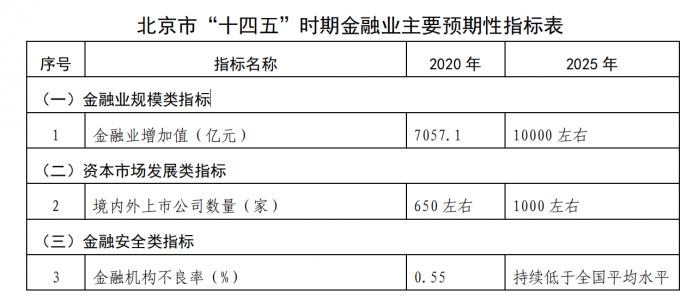 具体指标方面,2025年北京金融业增加值将实现10000亿元左右,境内外上市公司数量将达到1000家左右,金融机构不良率的目标为“持续低于全国平均水平”。