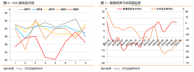 8月建筑业PMI继续回落2.7个百分点至56.5%,低于季节性水平,建筑业景气度有所回落。一方面,地产对建筑业景气度仍有拖累;另一方面,极端天气对基建施工亦有影响。