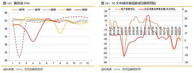 商品零售呈现弱修复状态,服务业修复放缓。服务业PMI回落幅度超季节性,预期亦有下滑。疫情和高温天气是最主要扰动,其中地产、居民服务、租赁及商务服务等行业指数仍处于收缩区间;业务活动预期指数为57.6%,低于上月1.2个百分点。