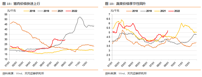 8月蔬菜价格继续上行。受8月南方持续高温,北方持续降雨、霜冻提前等极端天气的影响,部分蔬菜产区遮阳需求导致蔬菜种植成本提升,蔬菜产量也有所损耗,8月下旬以来蔬菜价格快速上行。随着8月高温逐步退出,叠加跨区域蔬菜运输平抑菜价,预计由供应短缺带来的蔬菜价格波动在9月或有所回落。