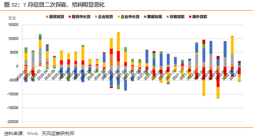 7月新增信贷二次探底,结构明显恶化,除票据融资和境外贷款外其他各分项均形成拖累。其中居民中长贷和企业中长贷同比少增最为明显。需要注意的是,去年7月一系列破除无效供给政策集中落地,社融信贷本身面临低基数问题,今年7月社融信贷数据在此基础上同比少增,更加体现当前经济面临的压力。