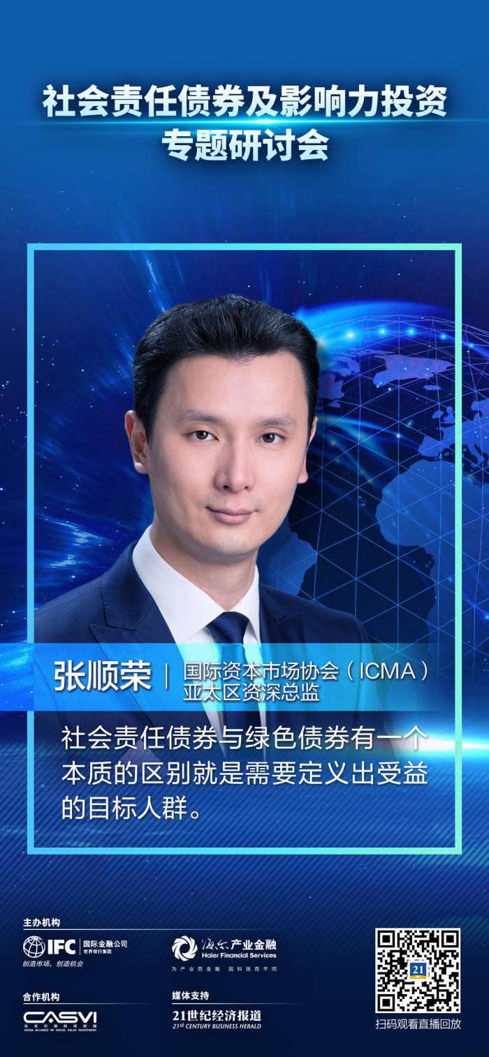 21世纪经济报道记者朱英子 北京报道 9月8日,在由世界银行集团国际金融公司(IFC)、海尔融资租赁主办,社会价值投资联盟协办的“社会责任债券及影响力投资”专题研讨会上,国际资本市场协会(ICMA)亚太区资深总监张顺荣出席并作主旨演讲。