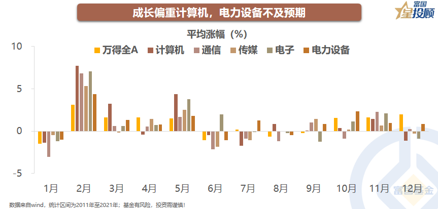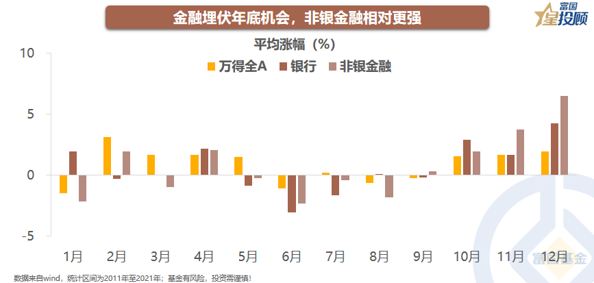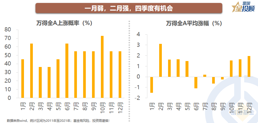 一月弱,二月强,四季度有机会。通过统计2011年至2021年(共11年)期间单月万得全A指数的涨跌可以发现,一月份获得正收益的概率为45.5%,平均涨幅为-1.51%,整体表现欠佳;二月份获得收益的概率为63.6%,平均涨幅为3.11%,整体表现优异;四季度各月获得正收益的概率都在50%以上,且平均涨幅均在1.5%以上,表现也相对较强。