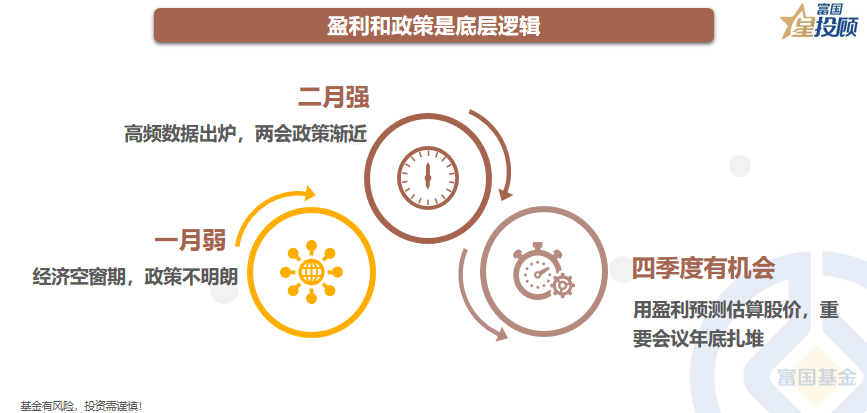 盈利和政策是底层逻辑。一月,经济数据处于空窗期,政策导向尚不清晰,市场主线难以把握,投资者试探性调仓,A股难有趋势性机会。二月,高频数据陆续出炉,两会临近期待政策,投资者开始躁动,A股赚钱效应提升。到了年末,投资者开始做企业的盈利预测,并用得出的盈利预测去估算目标股价。由于企业的盈利一般都会增长,叠加年末重要会议扎堆,A股往往表现较佳。