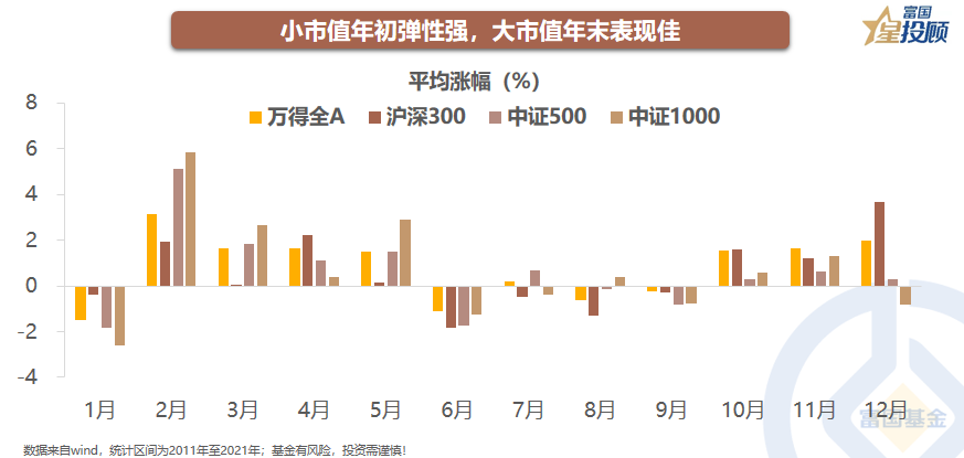 小市值年初弹性强,大市值年末表现佳。以沪深300、中证500、中证1000分别代表大、中、小市值可以发现,在年初时无论市场涨跌,小市值弹性都更强,而年末市场表现较好时,大市值整体更加占优。这或许与“年初市场倾向获收益,年末市场倾向保排名”有关。