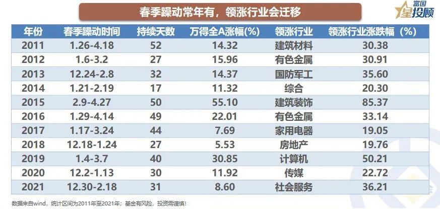 春季躁动常年有,领涨行业会迁移。除了从月度来看A股的统计规律外,市场关注度和认可度最高的日历效应是“春季躁动”。所谓春季躁动,是指每年春季前后A股会有不错的表现,背后是流动性相对宽裕和政策集中释放。从春季躁动的领涨行业来看,体现了经济结构由“投资拉动”向“转型升级”的变迁。