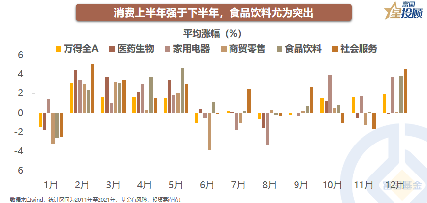 消费上半年强于下半年,食品饮料尤为突出。整体来看,消费板块也是上半年强于下半年。其中,食品饮料全年表现均不错,有望稳定的积累收益,得益于其平稳增长的业绩。