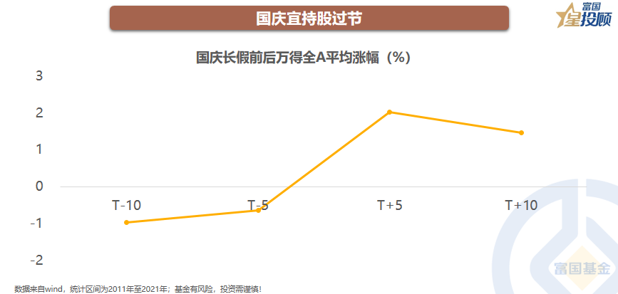 国庆长假宜持股过节。长假前后的日历效应,也为市场所广泛重视。从统计规律来看,国庆长假前两周,万得全A下跌0.97%;国庆长假前一周,万得全A下跌0.64%;国庆长假后一周,万得全A上涨2.01%;国庆长假后两周,万得全A上涨1.47%。因此,国庆长假持股过节或是不错的选择。