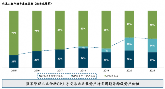 另按照年度交易额计,2020年和2021年GP主导与LP主导交易的市场占比均呈相当态势。与此同时,2021年,GP主导交易数量达2020年总量两倍以上;参与GP主导二级市场交易的普通合伙人质量显著提升。