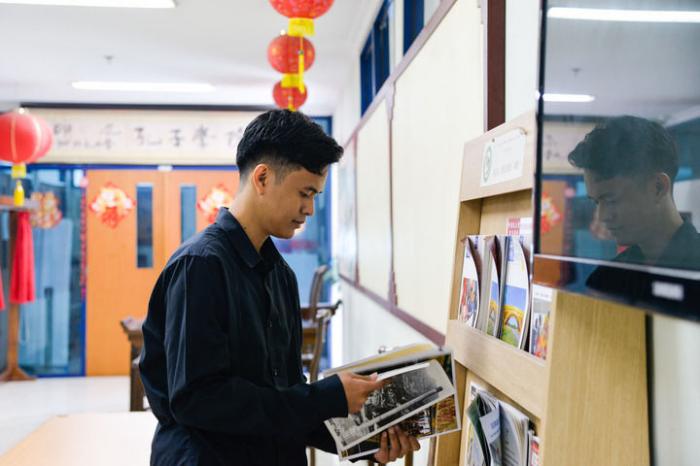 在阿拉扎大学孔子学院内,一名学生在阅读中文杂志。新华社记者徐钦摄