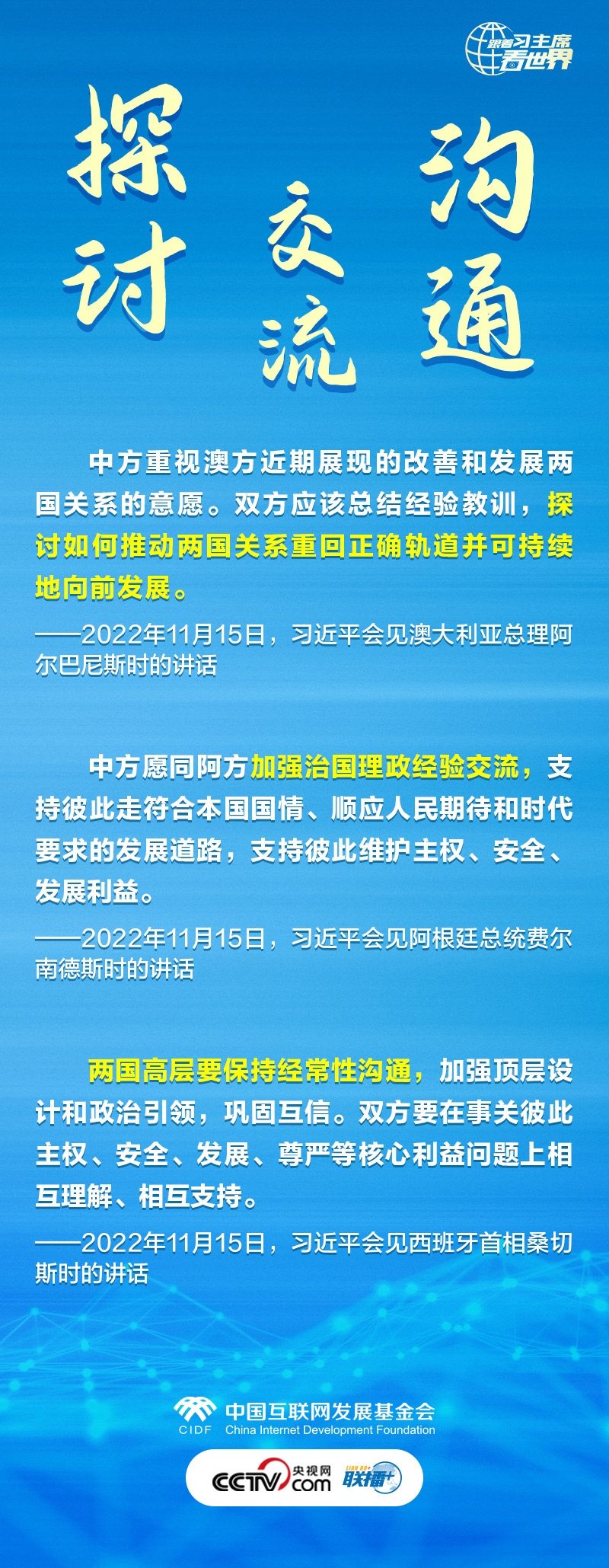 11月15日,分别会见法国总统马克龙、南非总统拉马福萨、塞内加尔总统萨勒、韩国总统尹锡悦、阿根廷总统费尔南德斯、荷兰首相吕特、澳大利亚总理阿尔巴尼斯、西班牙首相桑切斯;
