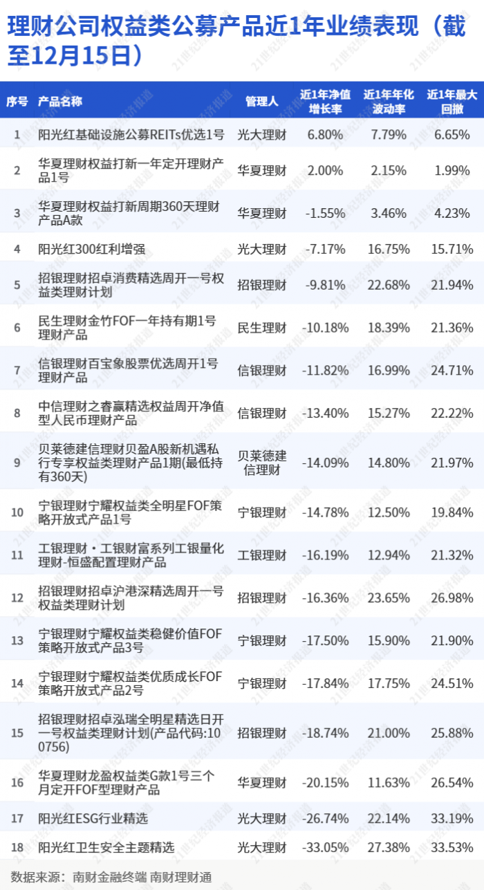 而从权益类理财表现看,榜单中18款权益类公募产品近一年平均净值增长率为-13.37%,18款产品中仅有2款产品录得正收益。