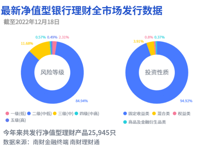 据南财理财通最新数据,截至12月18日,今年来全市场共发行净值型理财产品25,945只。