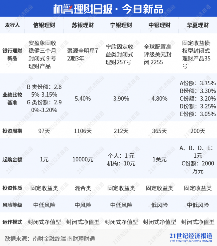 其中,一季度期间,有三款公募型产品成立,分别是贝莱德建信理财的“贝盈A股新机遇2期”、招银理财的“招卓专精特新”、光大理财的“阳光红新能源主题”,另有徽银理财、杭银理财、工银理财和招银理财各发行了一款私募产品。