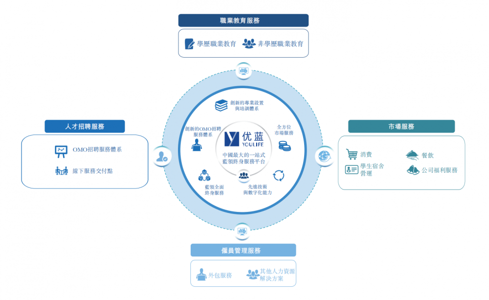优蓝国际是一家蓝领终身服务平台,业务包括职业教育、人才招聘、雇员管理及市场服务。形成了蓝领人才培养、招聘、外包、培训的产业链闭环。