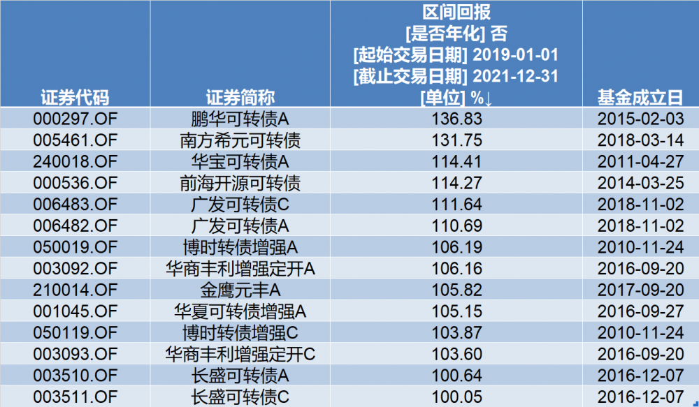 Wind数据显示,2019年-2021年,86只有可比数据的可转债基金 (在前面112只可转债基金的基础上进一步统计2019年前成立的基金)算术平均回报为67.62%,其中有14只回报更是超过了100%。