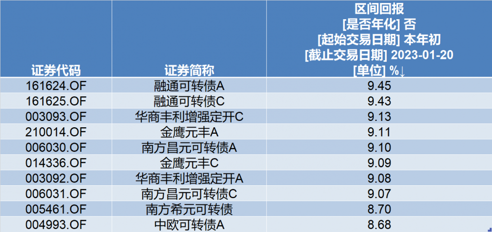 Wind数据显示,截至1月20日,全市场有统计数据的5119只(不同份额分开计算,下同)债券基金中,年内回报排在前10的就有6只为可转债基金。