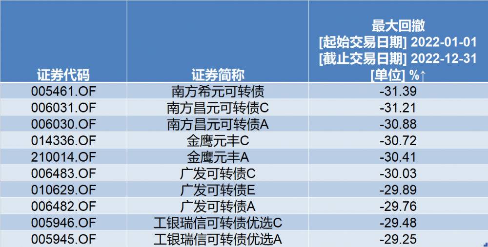 典型如在2022年里的表现。Wind数据显示,112只可转债基金年内仅2只收益为正,而南方希元可转债、广发可转债C等31只基金跌幅超过了20%。