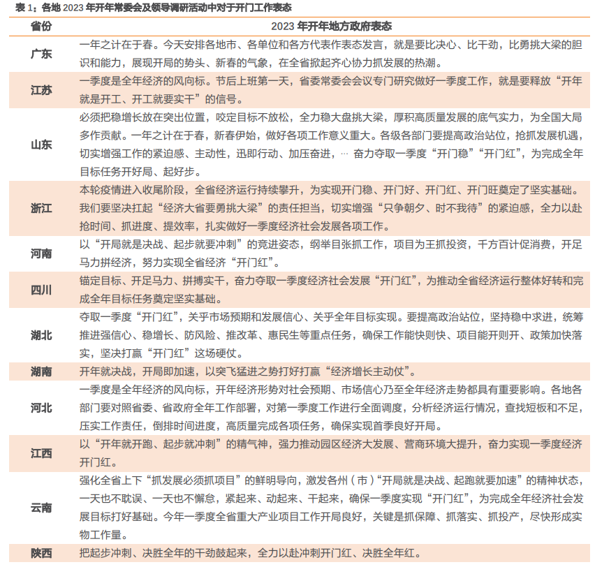 春节以来,各省陆续召开开年第一会、举办领导调研活动等,部署开年重点工作,传递出一季度开门红和全面稳增长的强烈信号。