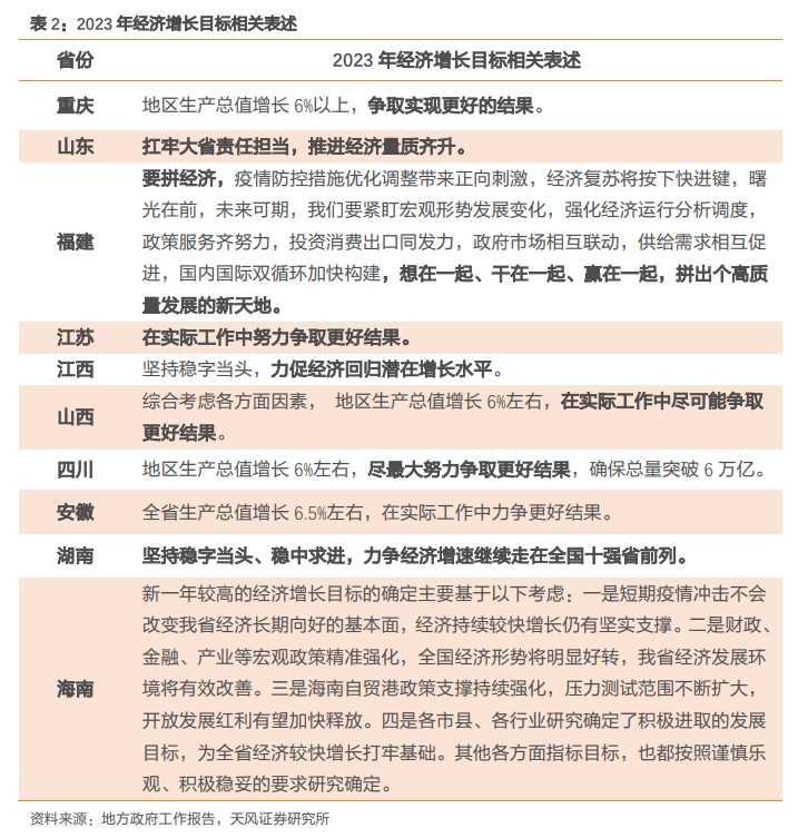 更进一步观察各省份对于2023年经济增长的相关表述来看,主要经济大省传递2023年经济增长的积极信号,例如,山东提出要“扛牢大省责任担当,推进经济量质齐升”;江苏省提及要“在实际工作中努力争取更好结果”;福建省提出“要拼经济…拼出个高质量发展的新天地”;此外,其它经济目标设定较高的省份也提出要争取更好结果,后期实际稳增长工作开展值得关注。