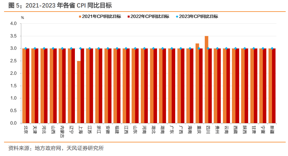 在通胀方面,近两年公布通胀目标的省份2023年均维持3%的通胀目标不变,我们预计中央政府通胀目标为3%。
