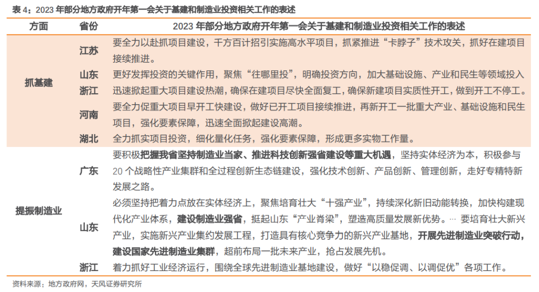 结合主要经济大省2023年春节后会议的具体部署来看,抓基建、提振制造业投资也是推动实现一季度开门红的重点工作方向。