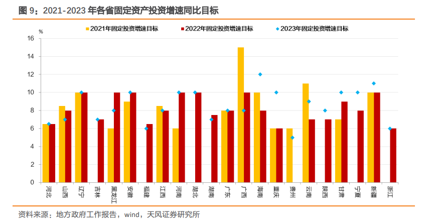 从各省份对于今年固定资产投资增速目标的设定情况来看,与2022年相比,2023年地方两会中公布固定资产投资增速目标的22个省份中,共有8个省份有明显提高2023年投资增速目标,有9个省份维持目标不变,5个省份下调2023年固定资产投资增速目标。