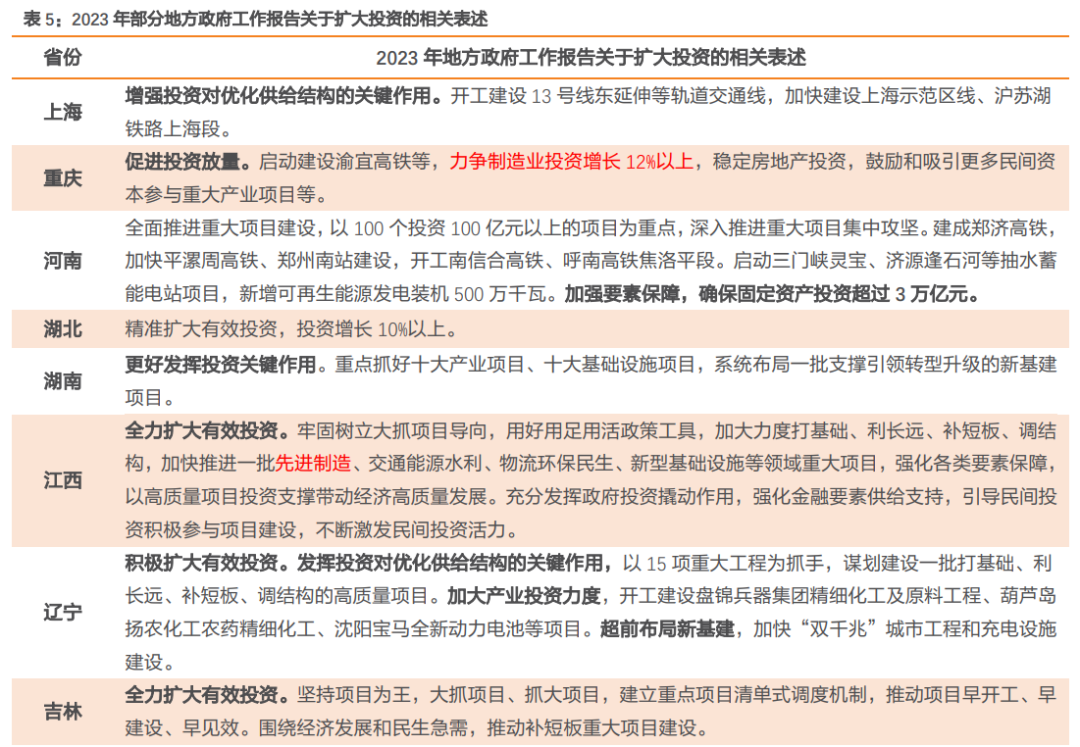 其中,多数省份在2023年工作目标中均延续强调“适度开展超前投资”等表述,预计2023年基建增速仍有支撑。重庆市、江西省、安徽省等多省份均对制造业投资有所着墨,重庆市提出要“力争制造业投资增长12%以上”。基于此,我们预计2023年制造业投资对稳增长的贡献程度将有所提升。