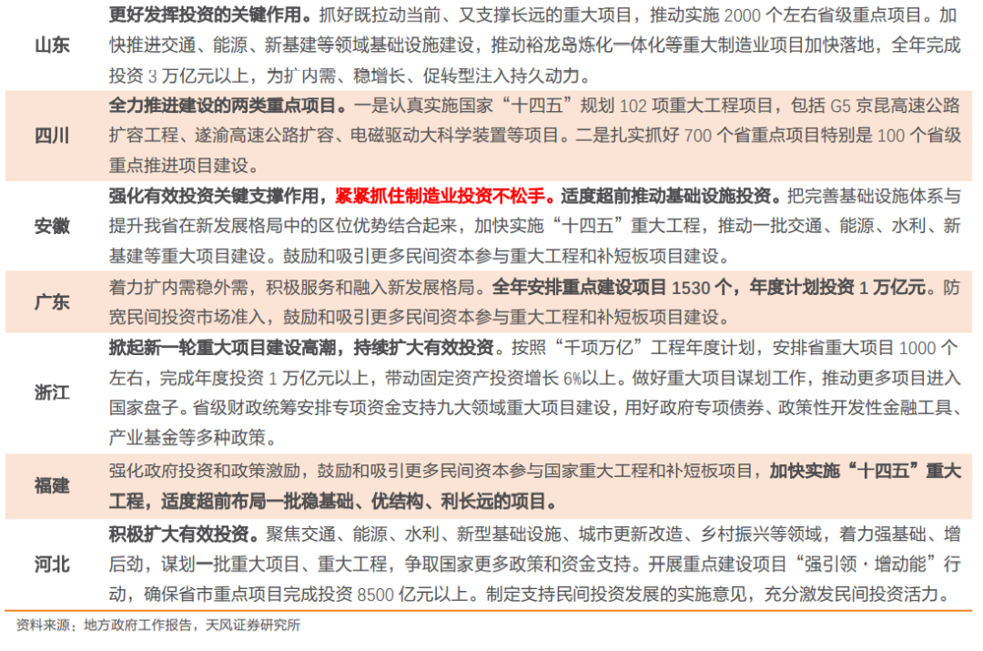 从各个省份的具体表述中观察,绝大多数省份在今年的政府工作报告中均重点提到要“扩大内需”,其中,“恢复和扩大消费”和“扩大有效投资”为多数省份的共性动作。