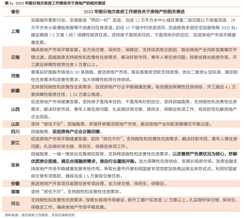 从供给端观察,保交楼仍然是2023年工作重心,此外,部分省份提及房企纾困相关内容,云南省提到要“支持优质房企脱困”,吉林省提出“以改善资产负债状况为核心,纾解优质房企困难,满足合理融资需求,推动行业重组并购…利用好国家保交楼专项借款,确保完成1.5万套保交楼任务”。
