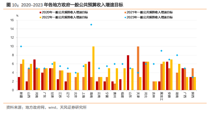 多数省份上调2023年一般预算收入目标。已公布2023年一般公共预算收入的23个省份中,河南、甘肃、上海、河北4省较2022年下调了一般公共预算收入目标,有6个省份2023年目标设定与去年持平,有13个省份上调2023年财政收入目标。