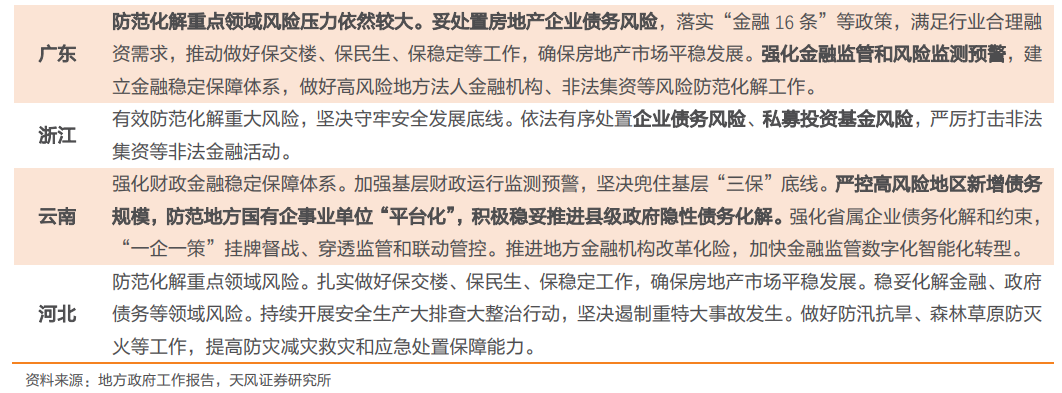 最后,在防风险方面,绝大多数省份均提及防范房地产风险,部分重点区域提及防范和化解地方政府债务风险与金融风险。