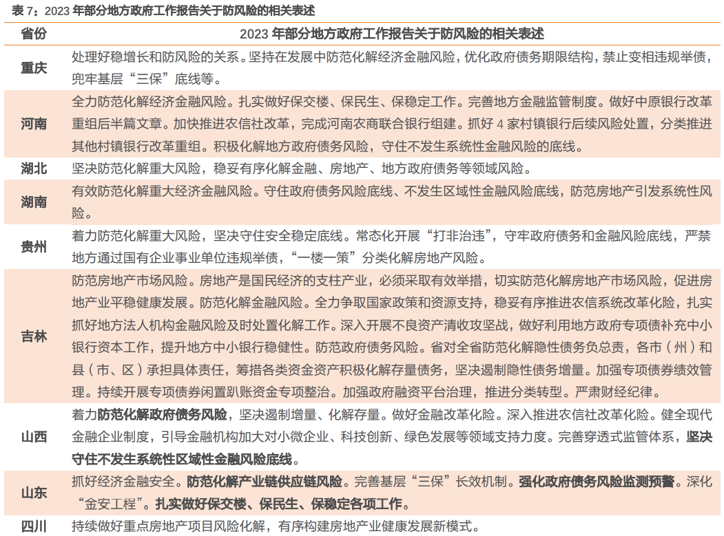 (2)山东、贵州、云南、河南等网红区域均提及地方政府债务风险问题。例如,云南省提到“严控高风险地区新增债务规模,防范地方国有企事业单位“平台化”,积极稳妥推进县级政府隐性债务化解”;贵州省提及“守牢政府债务和金融风险底线,严禁地方通过国有企业事业单位违规举债”。此外,北京市提到已“提前完成全域无隐性债务试点任务”。
