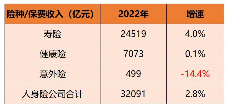 从人身险公司经营情况来看,2022年全年,人身险公司实现原保费收入3.2万亿元,同比增长2.8%;赔付支出6407亿元,同比下降5.23%。其中,寿险保费收入2.45万亿元,同比增长4%,占人身险公司总保费收入的76.4%;健康险保费收入7073亿元,同比微增0.1%,占人身险公司总保费收入的22%;意外险保费收入499亿元,同比下滑14.4%。