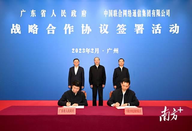 2月2日上午,广东省人民政府与中国联合网络通信集团有限公司在广州签署战略合作协议。省委书记黄坤明,省委副书记、省长王伟中与中国联通董事长刘烈宏共同见证签约。