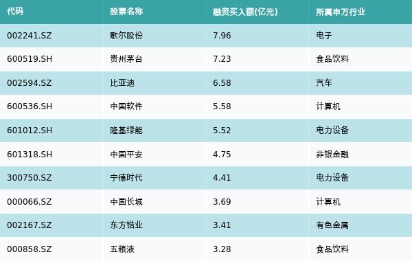 2月3日,两市共有3107只个股有融资资金买入,其中歌尔股份、贵州茅台、比亚迪排名前三,买入金额分别7.96亿元、7.23亿元、6.58亿元。融资买入额前10个股详情见下表: