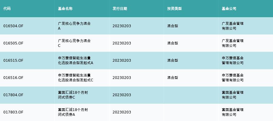 2月3日,有6只新基金发行,分别为:广发核心竞争力混合A、广发核心竞争力混合C、申万菱信智能生活量化选股混合型发起式A、申万菱信智能生活量化选股混合型发起式C、富国汇诚18个月封闭式债券C、富国汇诚18个月封闭式债券A,详情见下表: