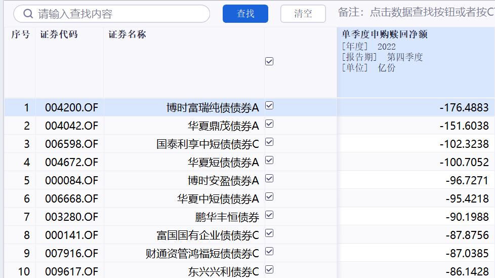 除了博时富瑞纯债A之外,去年四季度赎回份额超过百亿的债基还有华夏鼎茂A、国泰利享中短债C、华夏短债A等3只债券型基金产品的净赎回份额超过100亿份,分别约为151.6亿份、102.3亿份、100.7亿份,赎回率分别高达73.28%、62.85%、49.87%。