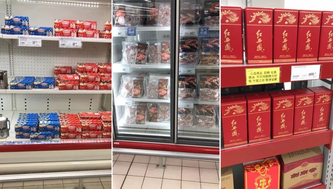 部分货架仅有前排货品,后排货架空置,但至少有货了。奶制品、生鲜、冷冻柜区域,依旧商品稀疏。