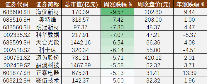 共有39只个股在本周下跌,没有周跌幅超过10%的个股。禾迈股份(688032.SH)、迈为股份(300751.SZ)、赛伍技术(603212.SH)在板块内领跌,周跌幅分别为7.35%、6.92%、6.71%、5.19%。