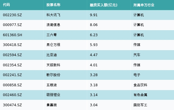 2月10日,两市共有3112只个股有融资资金买入,其中科大讯飞、浪潮信息、三六零排名前三,买入金额分别9.91亿元、8.06亿元、6.23亿元。融资买入额前10个股详情见下表: