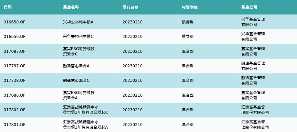 2月10日有8只新基金发行,分别为:兴华安裕利率债A、兴华安裕利率债C、嘉实ESG可持续投资混合C、融通慧心混合A、融通慧心混合C、嘉实ESG可持续投资混合A、汇添富战略精选中小盘市值3年持有混合发起C、汇添富战略精选中小盘市值3年持有混合发起A,详情见下表: